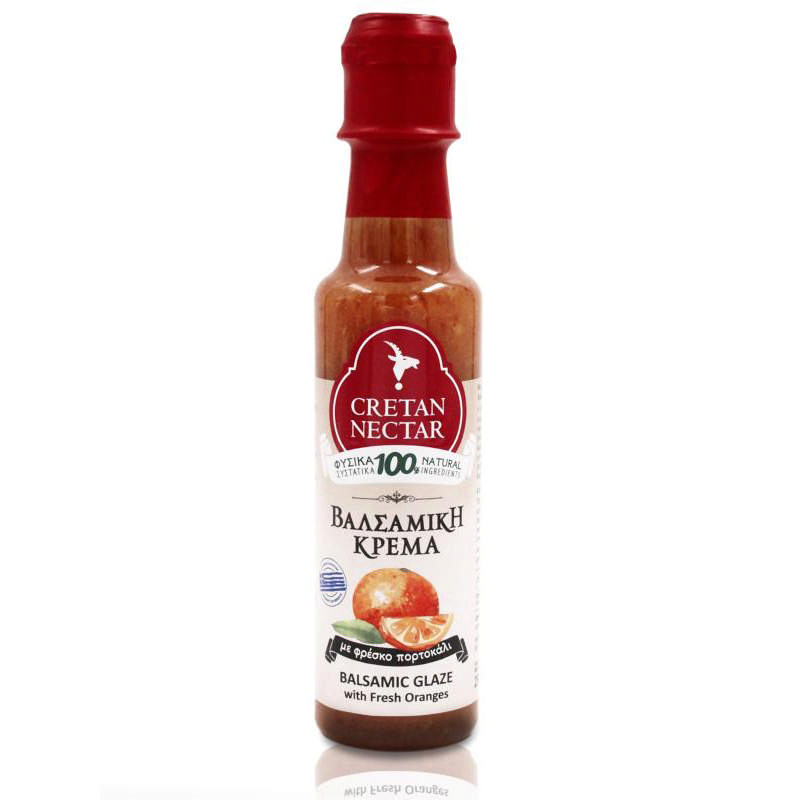 Denne lækre glaze er lavet af søde kretensiske appelsiner, koncentreret hvid druemost og hvid balsamico Den er helt uden konserveringsmidler og tilsætningsstoffer, og har en helt fantastisk naturlig duft og smag af appelsin.
