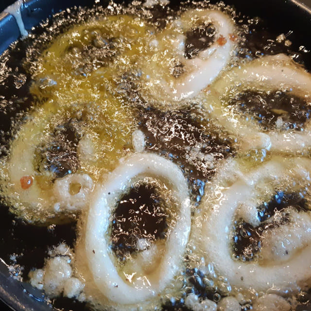 Olien skal være godt varm, men må ikke ryge, så vi skal i gang. (hvis du har et digitalt termometer, så er 165-175 grader på olien perfekt, når du begynder at lægge blæksprutteringene / stykkerne ned i panden)