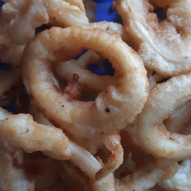 Vask blæksprutten indvendigt og udvendigt. Skær derefter rørene i ringe omkring ½ cm tykkelse, og tør dem rigtig grundigt i et rent viskestykke, tag derefter dejen frem igen. Bruger du en hel blæksprutte, skal resten skæres i stykker der ikke er mere end max. 1 cm tykt.